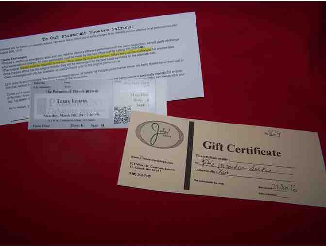 Two tickets to Texas Tenors on Saturday, March 5th, 2016 at the historical Paramount Theatre and a $25 gift certificate for food or drink at Jules Bistro. Both are located in downtown St. Cloud, MN.