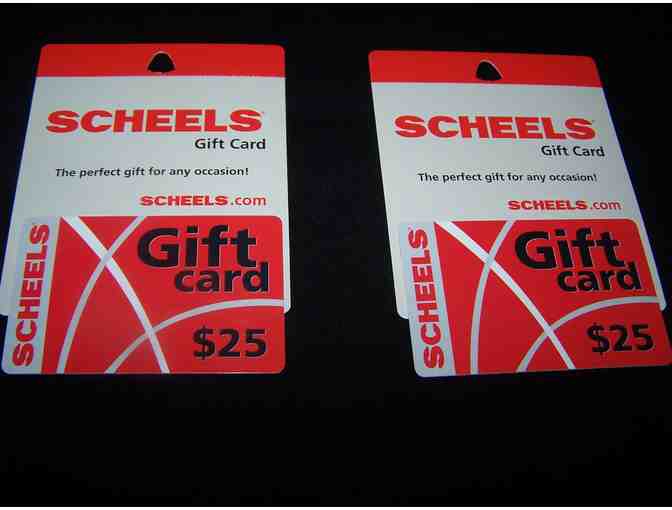 Two $25 gift card to Scheels Sporting Goods, Hunting and Fishing, or Home Store.