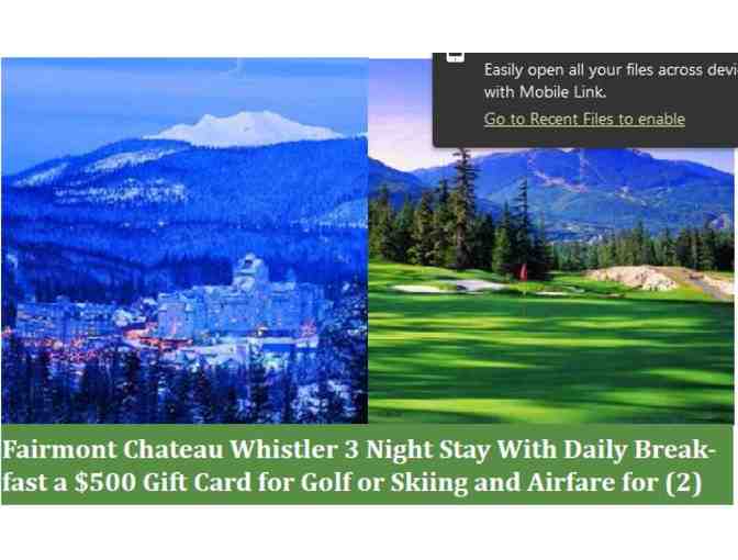 Fairmont Chateau Whistler 3 Night Stay With Daily Breakfast a $500 Gift Card for Golf or Skiing and Airfare for (2)