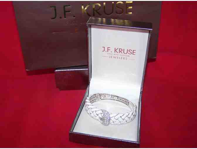 “Belle Etoile” Sterling Silver and white enamel braided buckle bangle bracelet with white cubic zirconia stones from J. F. Kruse Jewelers.