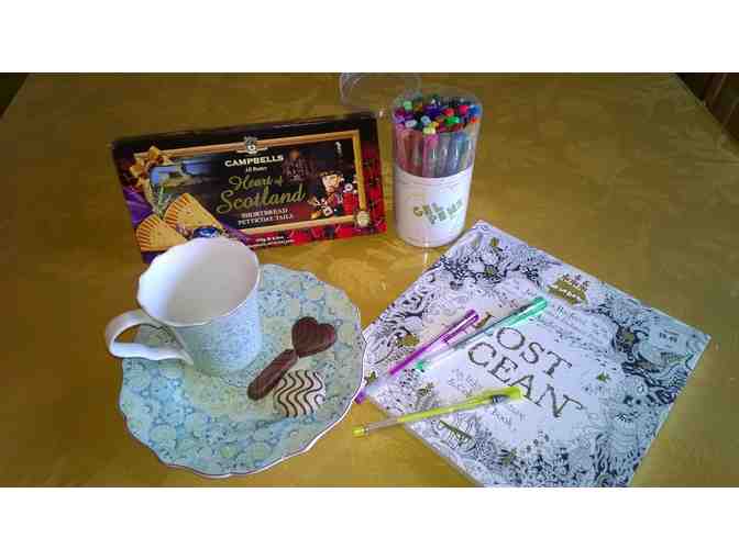 Enjoy the relaxing art of coloring in a beautiful Ocean inspired book with high quality gel pens while sipping tea in the fine porcelain china cup. Savor your Campbell's butter short breads from the beautiful porcelain plate. 40 gel pen collection including metallic, neon, glitter, pastel and classic colors Coloring is the new trend as a way to really relax and let your mind wander.