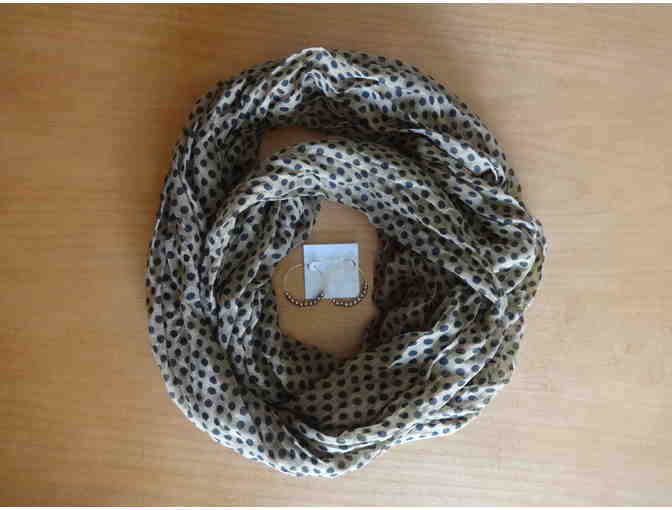 Fun, lightweight infinity scarf in tan/gold with black polka dots, measuring 72 inches around loop, 100% polyester.