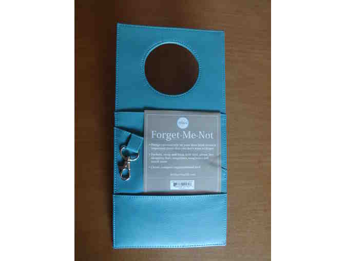 Stay organized!  Forget-Me-Not Organizer hangs on your door knob to store important items that you don't want to forget.  Pockets, strap and hook hold mail, phone, keys, shopping lists and more.