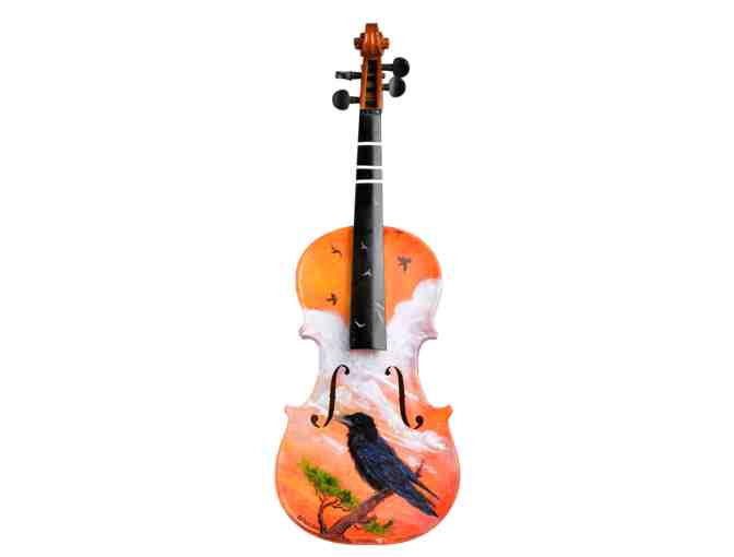 The unique painted violin was designed by Beth Erlund. According to Beth, "the music you hear in outdoor Colorado, especially amongst the bristlecone pines near Mt. Evans, is the sound of crows and ravens. Added to the singing of the wind in the pine needles, they provide a wonderful cacophony of racous music, sounding beautiful as only nature can." This piece was completed using oil and ancaustic.