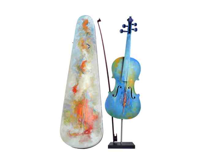 Stefan Geissbuhler has created a magnificient painted violin with matching case using acrylic, metal, and oak. This piece has a special stand and a way to display the violin bow. According to Stefan, "What makes the use of color so essential in my artwork is that, personally, it symbolizes life and the abilty colors have to affect us emotionally. The intention of my paintings and the use of abstracton is to engage the viewer in a non-verbal conversation ant to stimulate the imagination."