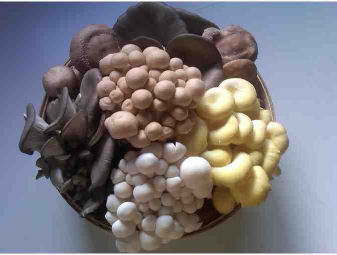 Approximately 3 lbs of fresh mushrooms, including many specialty varieties such as oyster, shiitake, maitake, portabella, crimini, king oyster and beech mushrooms. A booklet is included that describes each variety and some usage suggestions.