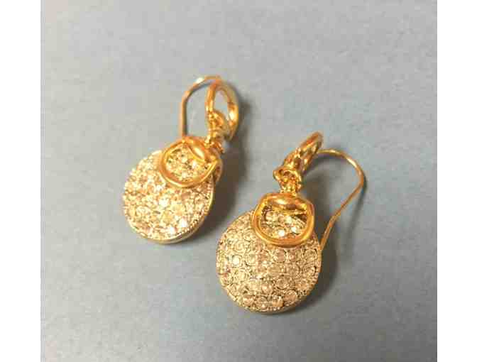 Treat yourself to a beautiful pair of gold tone horse bit earrings with cubic zirconia drop.