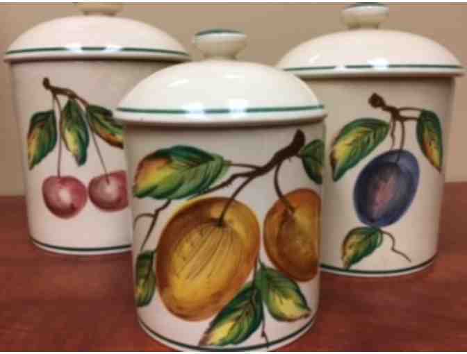 Adorable Italian fruits adorn these three kitchen canisters. Perfect for a country kitchen and to pair with similar platter/bowl on our auction.