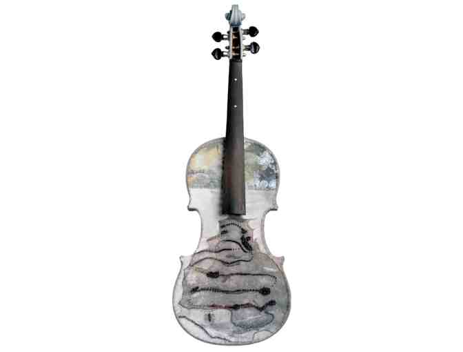 Kathy Mitchell-Garton created this fabric, beads, and thread decorated violin for this 12th painted violin season. In her own words, "This winter, I became fascinated with ice and it occurred to me that ice, like a musical instrument, is the solid form of something that normally flows."