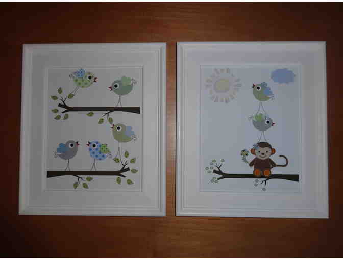 These five prints will light up your child's room. They can count the birds and find the monkey!  Frames are white wood with full glass.