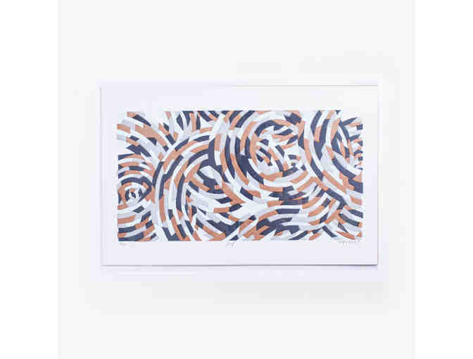 This piece is a nod to his Wall Drawing #1131 (Whirls and Twirls) which is installed at the Wadsworth Atheneum. His emphasis was commonly process based, but not always predictable or logical. Lewitt understood that execution of lines depends upon the artist’s perspective and strongly encouraged the idea of artist as architect. For this piece, we created our own fluid pattern, using basic shapes to give movement through color and composition. A system was formulated for placing color in their specific locations and each color was hand carved separately on its own linoleum block. Designed and printed by Kaitlin Lennon.