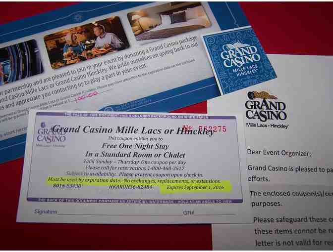 One Night Stay in a Standard Room or Chalet. Stay at either Grand Casino Mille Lacs or Hinckley. Valid Sunday-Thursday. Expires September 1, 2016.