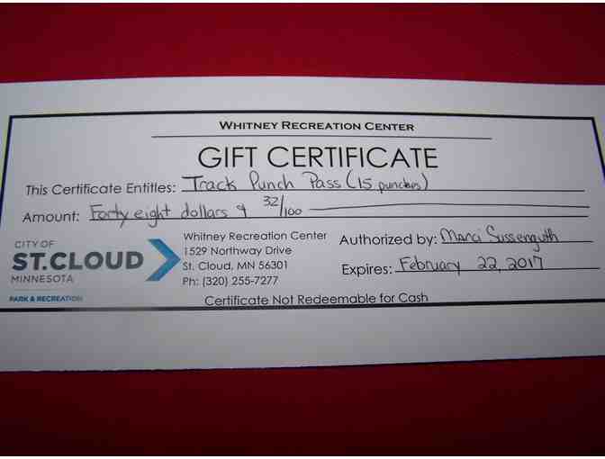 This pass is good for 15 visits/punches on the Whitney Center Indoor Track.