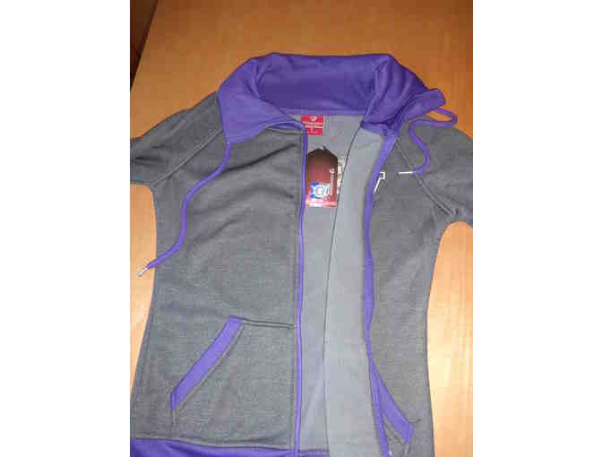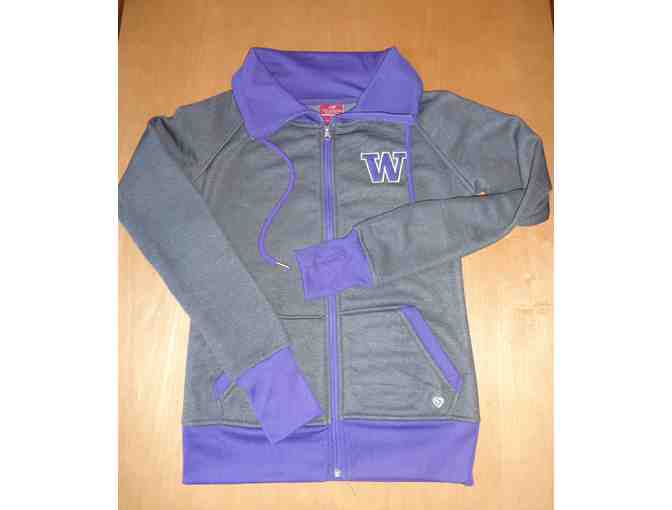 Cheer for your favorite team wearing your purple! Ladies size small jacket is full zip. It is a heathered dark gray with UW logo and purple accents. "Washington" is embroidered on the back with gold thread over purple letters. Two slash pockets keep your hands warm, while the fleece lining cuddles and warms. Cuffs have thumb holes.