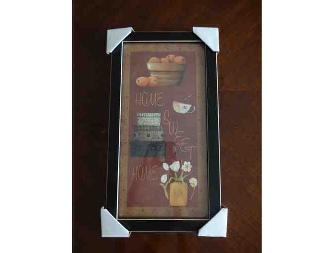 Glass framed print adds a decorative touch to your home. Black satin finish frame with gold accents.