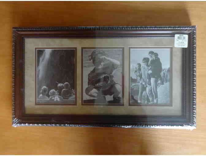 Display your favorite life events in pictures! This frame holds three 5 X 7 photos in a professional beveled matting. The outer matting is cream with swirls of light brown, and the inner matting is a soft brown. The frame measures 10 X 20 in a pecan finish with a decorative beading look on the inner face, and a classic scalloped look on the outer edge.