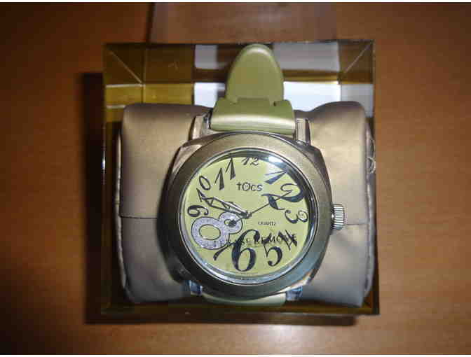 Have fun wearing this oversized (42mm x 42mm) face, green gold watch by Tocs. Soft resin strap with buckle clasp fits 6 to 9 inch wrists. Poly plastic impact resistant case. Water resistant to 3 ATM. Three hand quartz analog movement. Round bezel is approximately 1 1/2 inches.