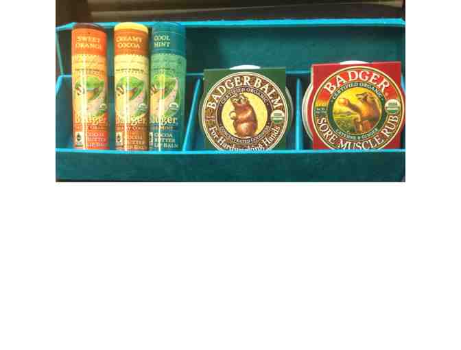 This auction item includes three (3) W.S. Badger Cocoa Butter Lip Balms (sweet orange, creamy cocoa, and cool mint); Badger Balm for Hardworking Hands; and a Badger Sore Muscle Rub. All products have been certified as organic.
