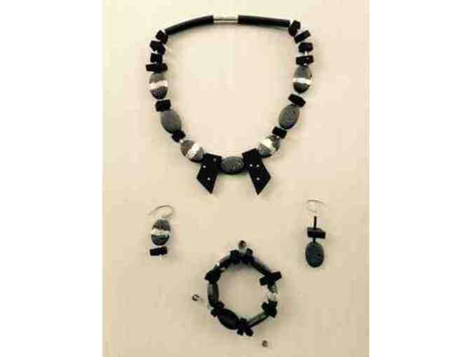 Matching Necklace, Bracelet and Earring set of green volcanic lava beads gilded with gold leaf, sterling tubing, and rubber foam. Necklace has a magnetic clasp. A one-of-a-kind set created by world renowned artist, Anna Skibska.