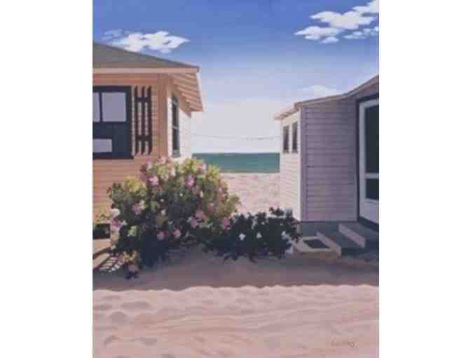 2" whitewashed framed giclee reproduction print on canvas, 'Lilac Cottages' on Shore Road in Truro on Cape Cod by local artist Susan Fornaro.