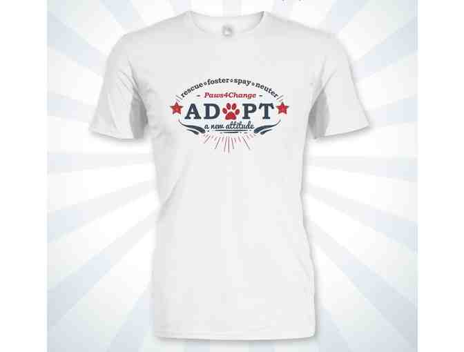 Anyone who has ever saved a mill dog or rescued an animal knows how much that animal means to them. So many people do not know the reward which comes with saving a life. This "Adopt a New Attitude" Shirt was designed by Paws4Change to be a conversation starter about subjects important to all of us: rescue, foster, spay, neuter and adoption. It was a one-time printing and is no longer available for sale. New, size large, white with blue and red print. This is a preshunk cotton/polyester blend shirt. It does have a slightly "athletic" fit.