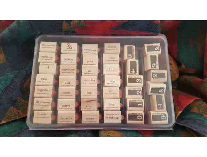 This is a RETIRED Set that is gently used (one stamp only appears to have been used). Hard to find this set. Set of 56 wood mount stamps with different words and phrases on them. Wonderful addition to a stamper's collection or for a craft room. This donor has multiple stamp listings in this auction! Please check them all out!