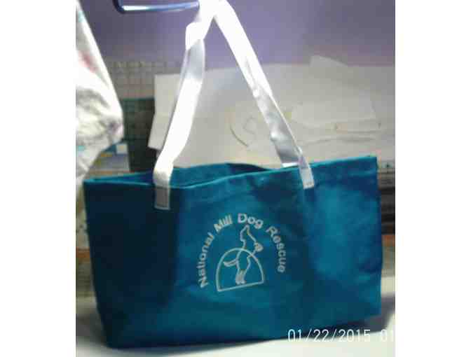 Medium weight canvas bag. It has a flat bottom and is about 18 inches wide, 2 inches deep and 9 inches tall. It has 2 white 2 inch wide straps. Has the National Mill Dog Rescue Logo embroidered on the front side.