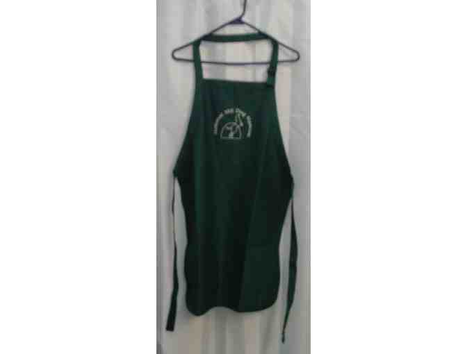 It is a green canvas apron that has ties around the waist and an adjustable strap around the neck. It has National Mill Dog Rescue Logo embroidered on the upper part. Great for NMDR volunteers to use at the kennel, or for your favorite chef!