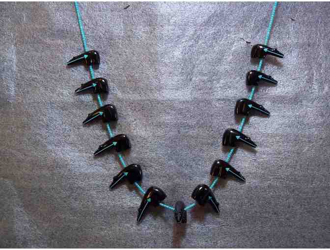 Handmade necklace, originally purchased from a New Mexico artist. Bears are black onyx with inlaid turquoise; largest bear in center is approximately 1-3/8 inches by 5/8 inch. Necklace is 24 inches long, with a 4-inch extender.