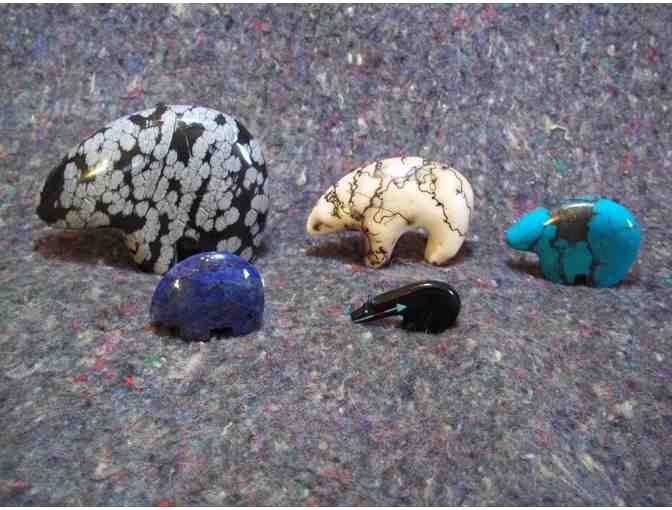 Four stone bears and one cream-colored horsehair pottery bear. Largest is 3-1/2 inches x 2-1/2 inches and smallest is 1-1/2 inches x 3/4 inch. Each is unique.