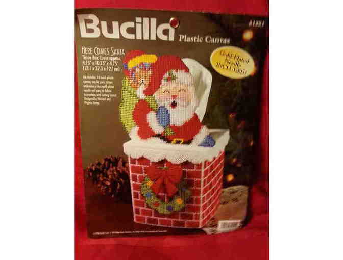 Here Comes Santa Tissue Box Cover by Bucilla. 4.75 inches x 10.75 inches x 4.75 inches. Needlepoint, 3-dimensional when finished. Not in original packaging but kit is complete.