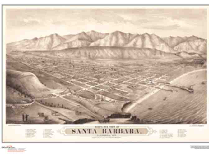 This Santa Barbara Antique Wall Map is a beautiful reproduction of an antique classic showing a panoramic view of Santa Barbara, California, 1877 looking north to the Santa Barbara Mountains. Drawn & published by E. S. Glover.