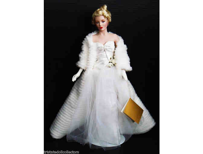 Crafted of fine porcelain and hand painted, Marilyn is wearing a white jacquard party gown, white fur coat, and "diamond" earrings. She is 19" tall and in her original box with a certificate of authenticity. New condition. Box gently worn.