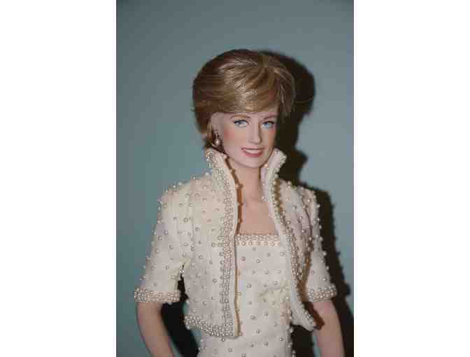 Franklin Mint Princess Diana 17" porcelain doll with purse and tiara. The Princess is wearing the beaded dress called her "Elvis Outfit." She stands on a round, wooden black doll stand and is in her original box. Includes original repair kit. Nearly new condition with one very small light stain on her dress. Box gently worn.