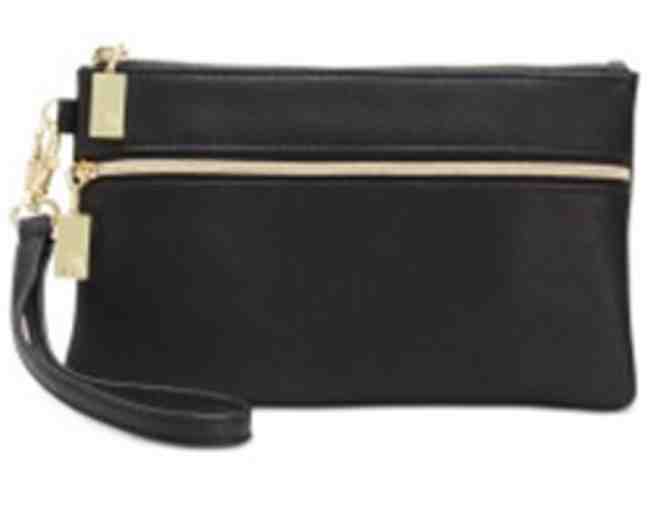 Style and Co. black clutch purse with a front zip pocket; faux leather; removable wrist strap with 4-inch drop and top zip closure. It has gold-tone hardware and one front zip pocket. Interior has three card slots. Size is 7 inches x 4 1/2 inches. New, without tags.