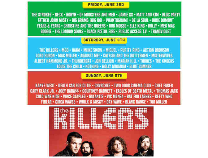 Tickets for two for entire festival included. Friday and Sunday General Admission. Sat VIP tickets with Meet and Greet with The Killers.