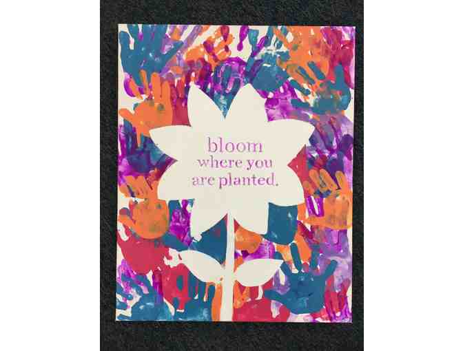 Acrylic painted hand prints from Mrs. Bahr's class with a custom hand painted quote in the center of a reversed out flower shape. Colors are gorgeous and design worthy.