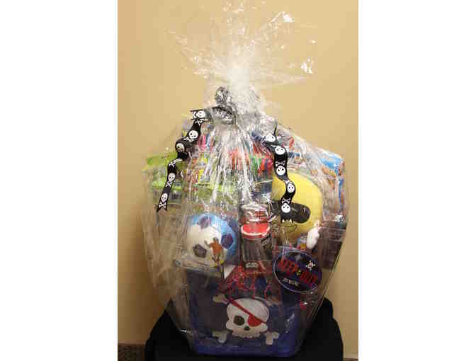 Basket includes Hamper Hoops, Draw Jammies, Emoji-Kins, Snackeez (Star Wars), Hover Ball, Snackeez, Shower Wow, Magic Pens, Bunch O Ballons, Juggle Bubbles, Wubble Ball, Pirate storage bin and a "Keep Out" sign.