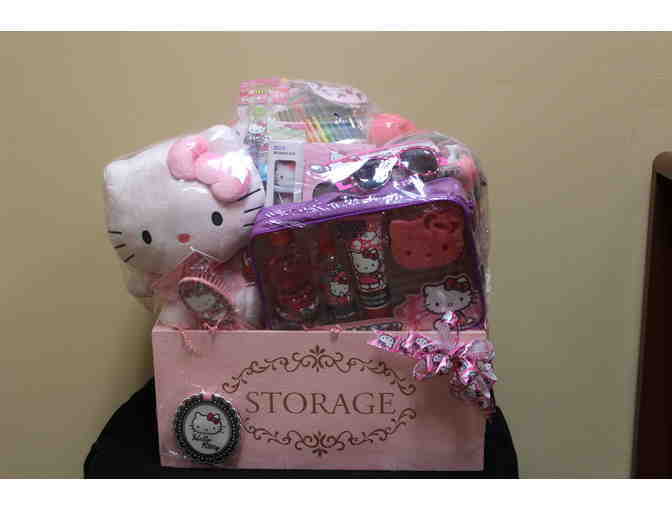 You know her name; You've seen her signature red ribbon; And now this gorgeous basket of all things Hello Kitty could be yours! Basket includes Stuffed Hello Kitty, Travel Pillow,Travel Duffle Bag, Sunglases, Coloring Set, Hair Brush, Slippers Thermos, Sleep Mask, Luggage Tag, Alarm Clock, Throw/Blanket, Selfie-Stick, Toothbrushes & Storage Bin.