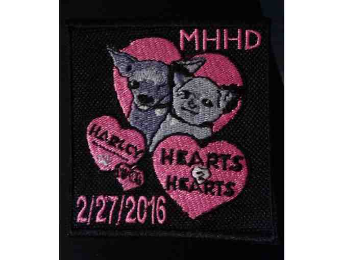 3" x 3" Custom-made commemorative Harley to the Rescue - Hearts 2 Hearts patch from our 2/27/16 rescue, featuring Harley and Teddy. Limited production.