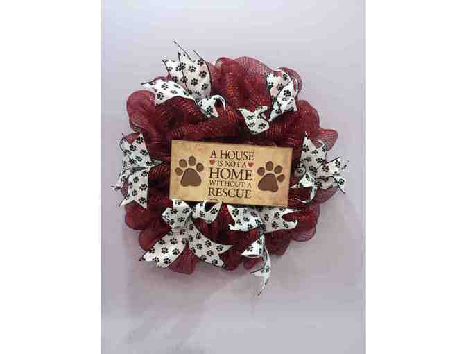 This wreath is handmade with deco mesh and black and white paw print ribbon.