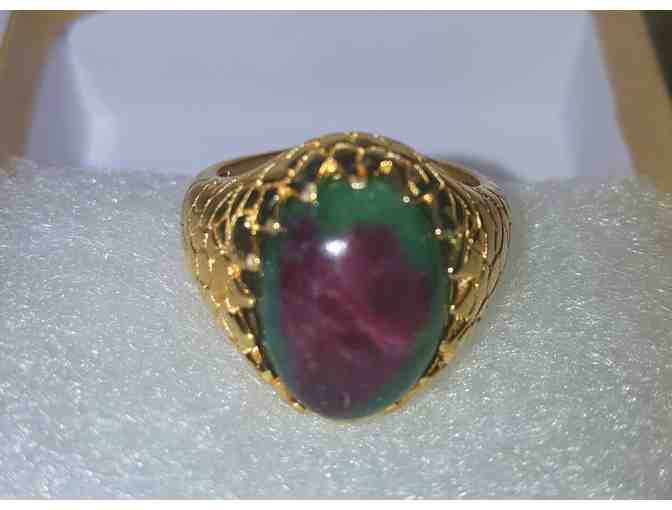11 ct Ruby Zoisite Ring, 14k Yellow Gold overlay of sterling silver. Size 9, Nickel free. This is a very lovely ring that has a unique animal print design on the metal and features a large stone that is a beautiful mix of deep green and red.