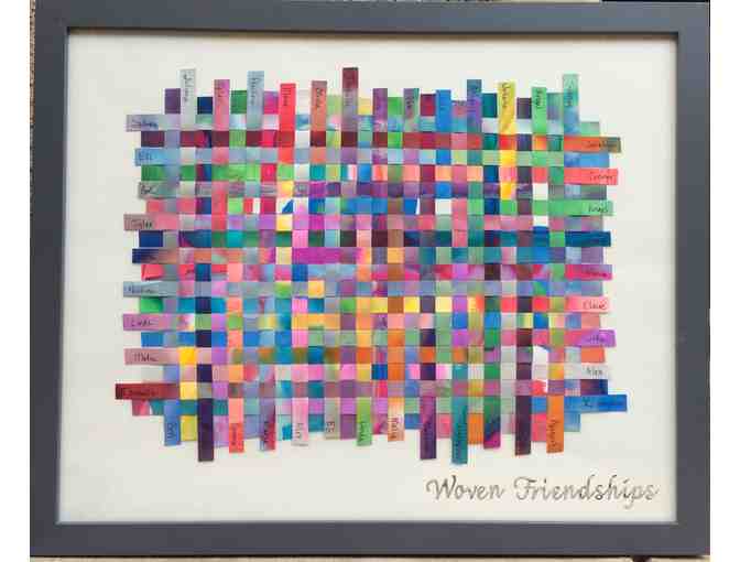 This colorful art piece was created by weaving strips of paper that were watercolored by each student in Mrs. Domes' and Mrs. Kardums' class together. Each students name is on the strips of paper they painted.