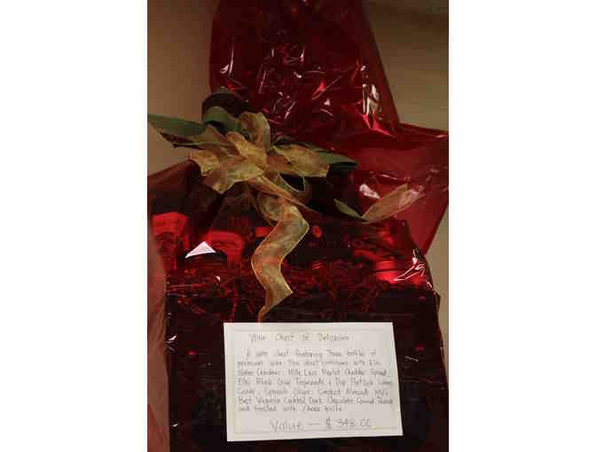 A wine chest featuring 3 bottles of premium wine. The chest continues with Elki Water Crackers, Mille Lacs Merlot Cheddar Spread, Elki Black Olive Tapenade & Dip, Portlock Salmon Caviar, Spanish Olives, Smoked Almonds, MV's Best Virginia Cocktail Dark Chocolate covered peanuts and finished with cheese knife.