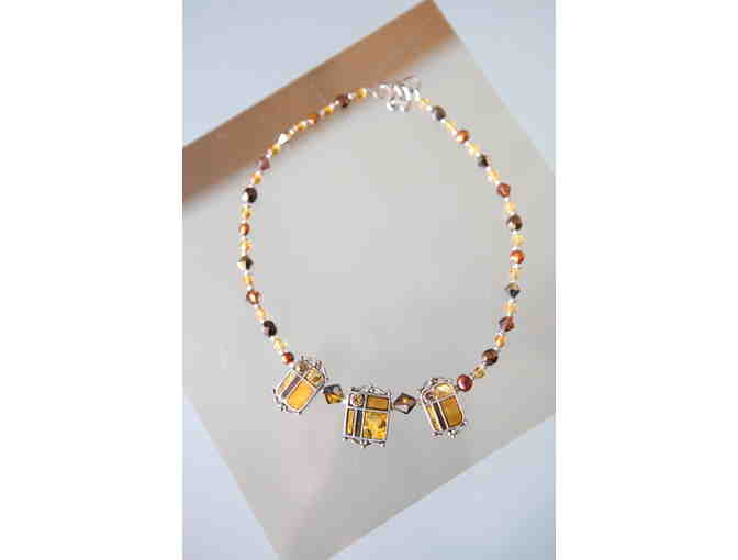 Handmade by FTCNS parent Stacy Kvet: 14 inch necklace with amber, copper, and bronze-colored Czech crystals and 3 small metal pendants with tiny crystal embellishments.