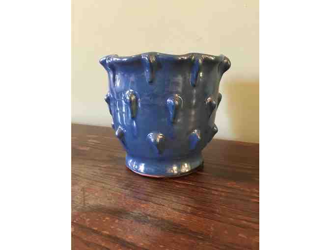 A royal blue planter (approximately 8" tall) and gift certificate for $75 floral arrangement in the planter.