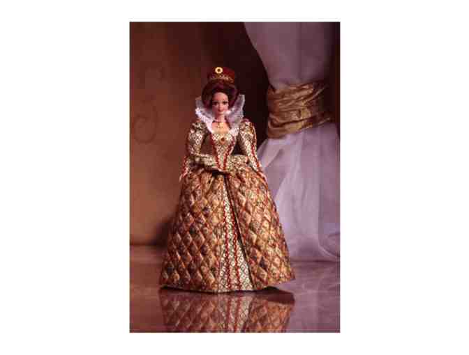 From The Great Eras Collection, Barbie achieves true royal stature in a stunning quilted dress reminiscent of the 16th century. Representing Queen Elizabeth, Barbie's luxuriant red, white, and golden gown has a full skirt, fitted top with long sleeves, and lacy collar. Her dramatic hairstyle, regal hat with golden trim, and golden cross necklace add elegant touches to this already incredible costume.