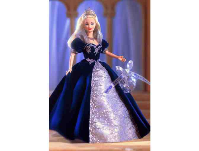 Millennium Princess Barbie doll is dressed in a magnificent royal blue velvety gown with shimmering organza and silvery glitter lace cascading down the front. A lovely tiara, sparkling necklace, and a "crystal" ball keepsake ornament make her a beautiful way to welcome the year 2000!