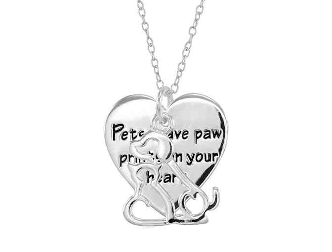 Featuring a cute pendant with a "Pets leave paw prints on your heart" inscription and pet silhouette charm, this silver-plated necklace embodies sweet sophistication.