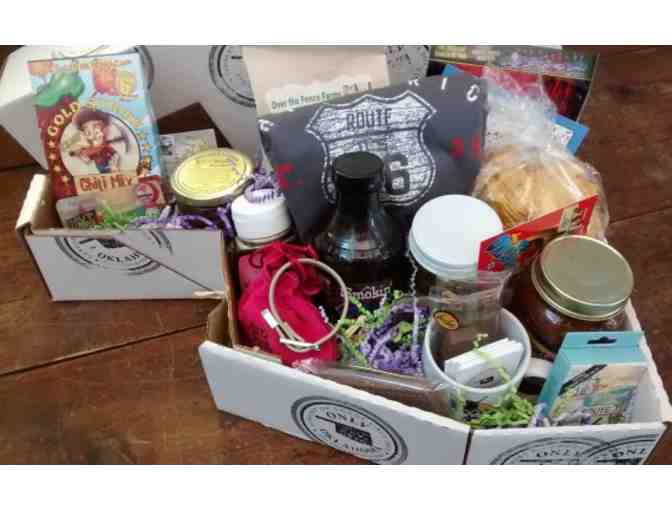 "Big Okie" gift box from Only Oklahoma, a new company that specializes in creating awesome gift baskets with products made only in Oklahoma. You can customize and add on items are available (like Rustic Cuff)! This box includes: BBQ Sauce, Beef Jerky, Candied Jalapenos, 3 Vintage Postcards, Playing Cards, Oklahoma mug, Route 66 T-Shirt, Gold Strike Chili, Bedre Chocolates, Salsa, Pretzels, Pickled Garlicand Tortilla Chips, and Rustic Cuff - ALL MADE IN OKLAHOMA!! Check out their website at onlyoklahoma.net.